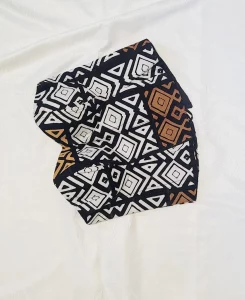 Ce bustier en pagne revisite les codes du vêtement traditionnel avec une touche contemporaine et audacieuse. Son imprimé graphique noir, blanc et ocre attire le regard tout en restant facile à associer.